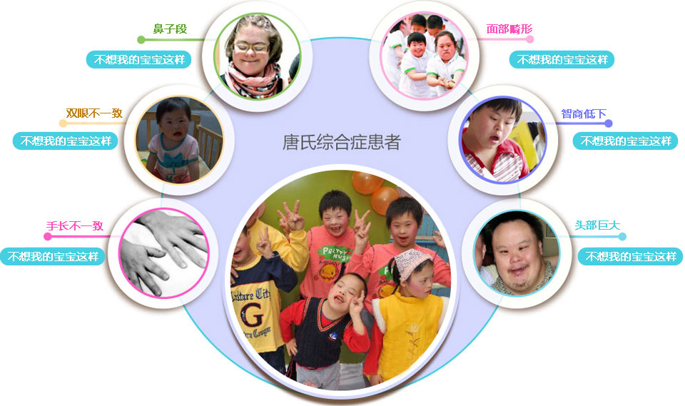 “唐氏儿”除了具有明显的特殊面容体征外,还常表现出嗜睡和喂养困难,其智能低下表现随年龄增长而逐渐明显,动作发育和性发育都延迟。男性唐氏婴儿长大至青春期,也不会有生育能力。“唐氏儿”常伴有先天性心脏病等其他畸形,因免疫功能低下,易患各种感染,白血病的发生率比一般增高10~30倍。如存活至成人期,则常在30岁以后即出现老年性痴呆症状,会给整个家庭带来沉重的精神和经济负担。